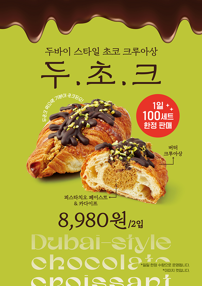 ‘두초크’는 버터 풍미가 살아 있는 크루아상 속에 피스타치오 페이스트와 크런치한 카다이프를 풍성하게 채워 넣고, 그 위에 달콤한 초콜릿 드리즐과 피스타치오 분태를 더한 것이 특징이다. 크루아상의 부드러운 풍미와 크런치한 필링이 조화를 이루며, 과하지 않은 달콤함으로 여러 번 먹어도 질리지 않도록 완성했다. 가격은 ‘두초크’ 2개입(이마트) 8980원, 3개입(트레이더스) 1만 2980원이다.