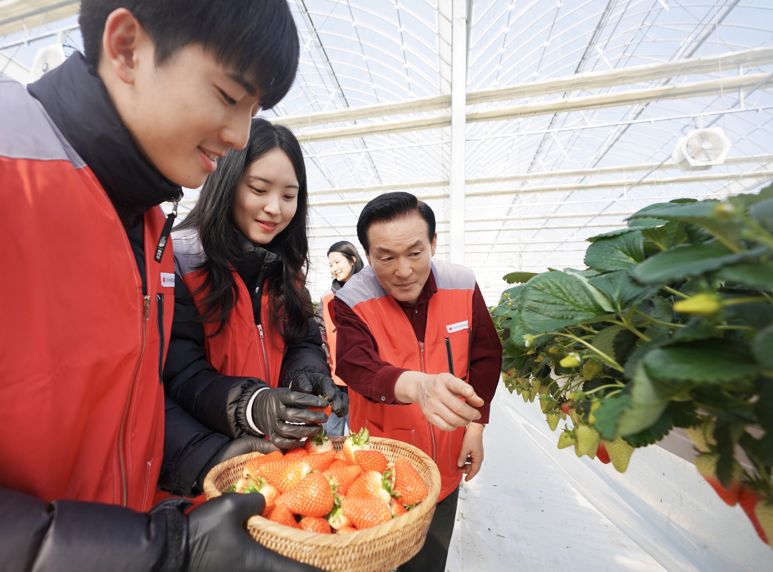 [사진 설명] 지난달 31일 신세계푸드 임직원과 가족들이 충남 논산시 광석면에 위치한 베이커리용 딸기 공급 협력 농가에서 모종 잎 제거, 수확 및 선별 작업을 하는 봉사활동을 펼쳤다. 이날 봉사활동에는 신세계푸드와 상생 업무협약 및 협력활동을 이어가기 위해 백성현 논산시장(오른쪽)이 동참해 의미를 더했다. / 신세계푸드 제공